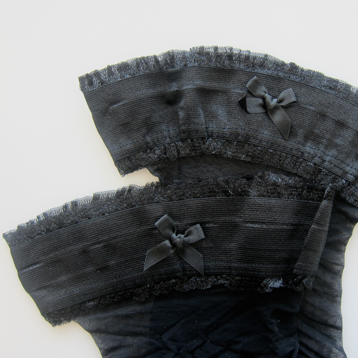 20 DEN. Autoreggente trasparente arricchito da una splendida balza liscia ricamata. La caratteristica di questo autoreggente è proprio la balza, molto bassa, con i bordi arricchiti da rouches e con un piccolo fiocco applicato.