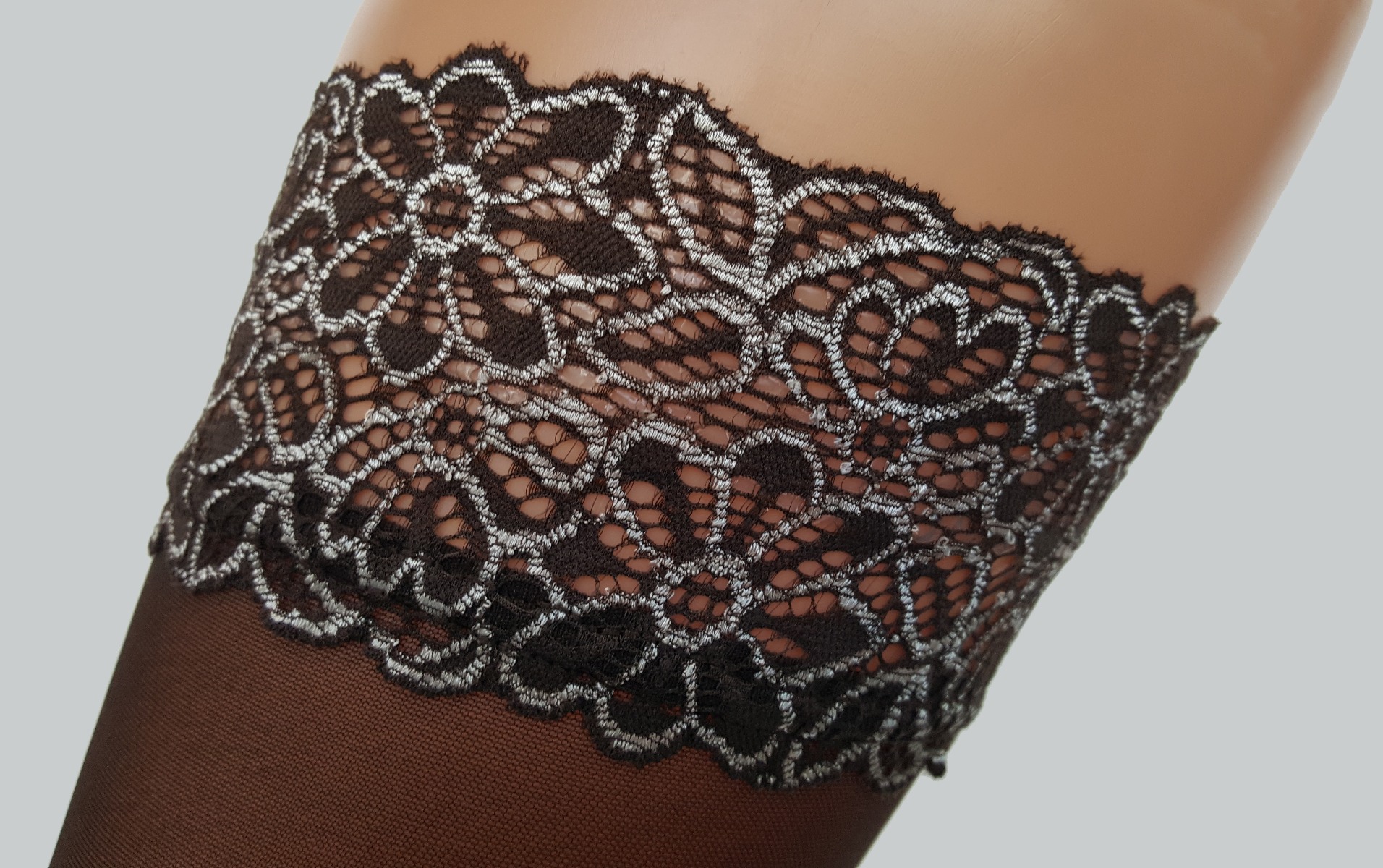 La calza è arricchita da una balza in pizzo floreale, tono a tono, con effetto melange.